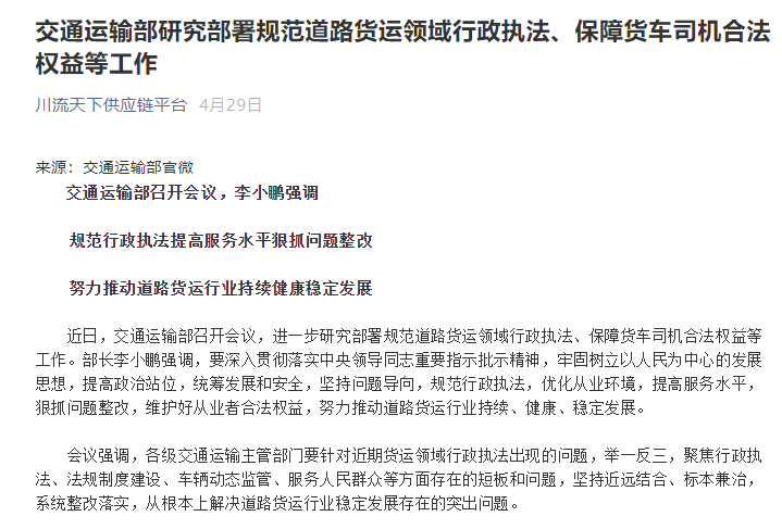 交通运输部研究部署规范道路货运领域行政执法、保障货车司机合法权益等工作